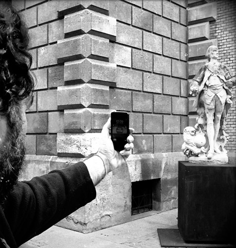 ¿Cómo me he enterado? Resulta que hace un par de días tuve que ir a Barcelona, invitado a un coloquio sobre fotografía y posmodernidad. Tras el acto, tenía la cabeza como un bombo y decidí relajarme paseándome por la ciudad. Las bellas luces de la tarde me animaron a hacer alguna foto, pero no conseguía el encuadre perfecto. Pero hete aquí que en esto me veo a un señor inmóvil en un parque, fotografiando una espectacular puesta de sol. Era una imagen espléndida. Y era él: el mismísimo Fontcuberta. Esperé a que se marchara de la zona para repetir su foto (porque hay que aprender de los maestros) y lo seguí para comprobar, asombrado, que iba haciéndole fotos con su iphone a todo lo que se le ocurría. No paraba de crear y crear. Aquí lo podéis ver haciendo una: