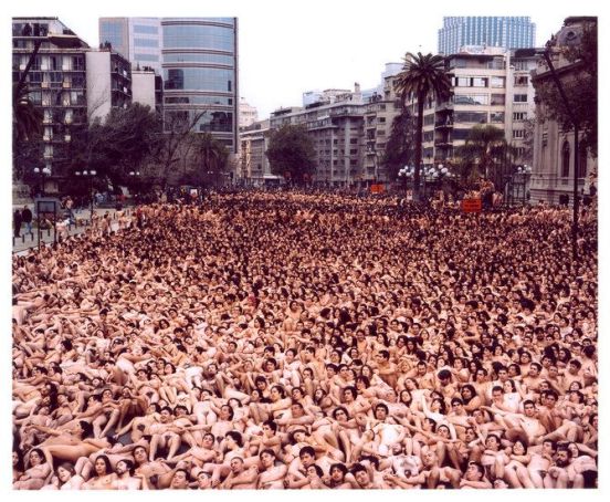 Y digo yo. ¿Quién en realidad reflexiona ante estos paisajes desnudos, esas masas de cuerpos en pelotas en espacios públicos, sobre el significado verdadero de la desnudez humana? ¿Quién se calienta la mollera sobre dónde están los límites entre lo púbico y lo público, lo moral y lo inmoral, lo permitido y lo prohibido, lo gregario y lo solitario, Sodoma y Gomera, etc.? ¡Nah! Lo que Tunick despierta en cada uno de nosotros es el insaciable voyeur que todos llevamos dentro. ¡Pocas noches he pasado yo descargando imágenes suyas de internet e interpolando a machete para poder ver bien los detalles…!