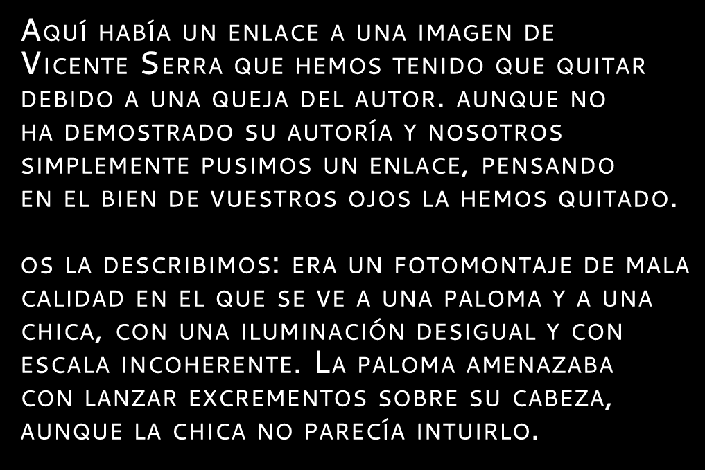 NOTA: Debido a que no podemos incluir la imagen como tal, a pesar de que se encuentra públicamente accesible en Internet (o se encontraba porque parece que ya se ha preocupado alguien de borrarla), os informamos que la foto en cuestión puede (podía) admirarse libremente en el foro Canonistas y en Flickr.