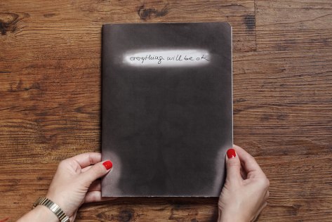 En el caso de que nos resulte imposible enfundar nuestro libro o no queramos, debemos al menos ponerle unas cubiertas de un material atractivo (estilo telita va bien). Otra opción puede ser invertir en el diseño de las sobrecubiertas con solapas (la propia palabra nos indica que nos pueden ayudar a solapar cosas). La última alternativa para hacer el libro seductor por fuera es gastarnos los cuartos en un diseño de portada molón. Un ejemplo puede ser Every thing will be ok de Lizarralde, que dió el campanazo con una portada termoreactiva. El lector puede tirarse experimentando con la estela que su paso deja en la obra horas y horas. Los niños podrán usarlo para jugar a detectives, analizando huellas dactilares.
